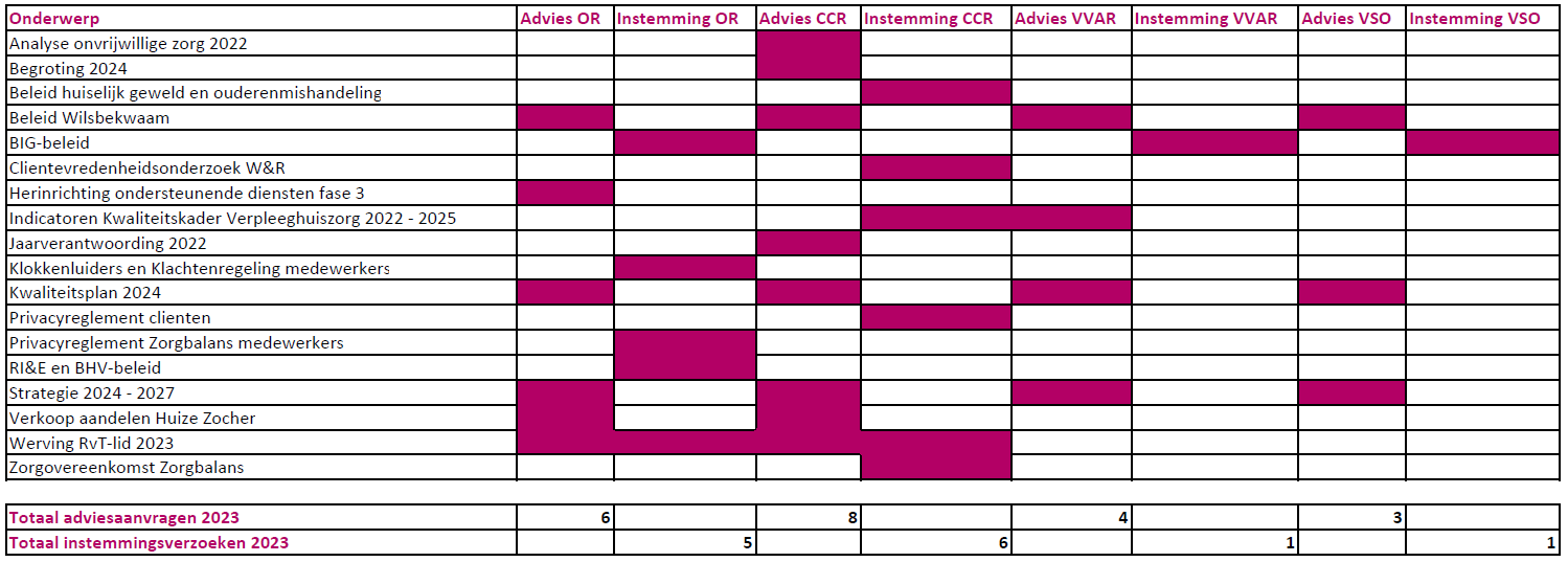 De Ondernemingsraad (OR), de Centrale Cliëntenraad (CCR), de Verpleegkundige en Verzorgende Adviesraad (VVAR) en de Vakgroep Specialisten Ouderengeneeskunde (VSO) hebben ieder in 2023 tweemaal afzonderlijk, overleg gevoerd met de RvT.